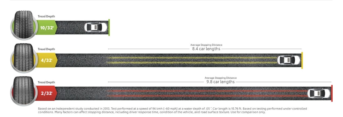 The right tread depth is critical for adequate stopping power. The ideal tread depth is at least 10/32 inches, enough to cover Lincoln's head if you insert a penny upside down at different locations along your tires. At 4/32 inches, the average stopping distance increases to 8.4 car lengths, and 2/32 inches increases the stopping distance even further to 9.8 car lengths, creating a dangerous situation where your vehicle is slow to stop and greatly increases the risk of collisions.